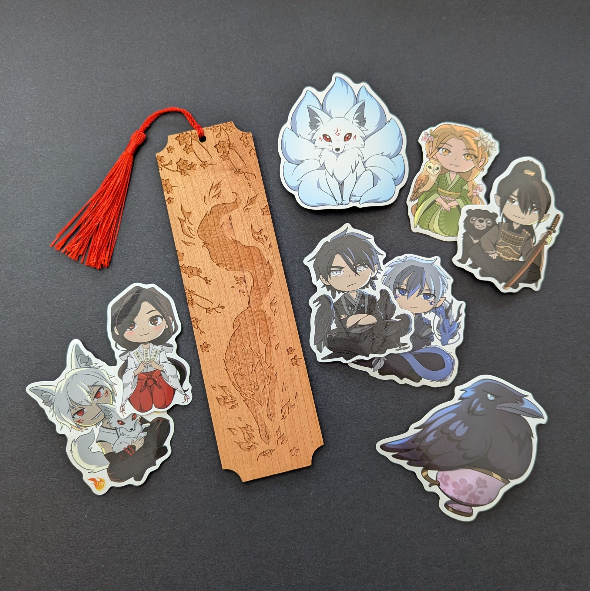 This wooden bookmark and sticker bundle was originally included with each Red Winter Special Edition Hardcover during the Kickstarter campaign.